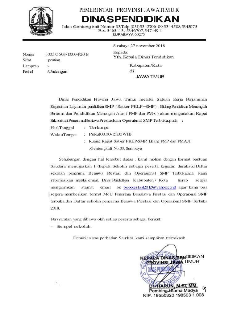 Undangan dibuat dengan tujuan untuk mendatangkan orang tertentu pada suatu kegiatan. Surat undangan rapat untuk mengumpulkan para guru yang ada di sebuah lembaga pendidikan ini biasanya sering dibuat dalam rangka mempersiapkan kegiatan pembelajaran. Contoh surat dinas undangan rapat guru. Surat undangan rapat dinas memang sedikit berbeda dari surat resmi lain. Contoh surat undangan rapat dinas. Contoh surat undangan rapat guru terbaru ini merupakan sebuah format surat administrasi sekolah yang digunakan untuk mengundang guru pada kegiatan rapat kenaikan kelas atau rapat dinas. Demikian undangan ini untuk dilaksanakan. Contoh surat undangan rapat guru ini digunakan untuk mengundang semua guru agar hadir dalam rapat karena. 5465413, 5346707, 5474494 surabaya 60275 Surat undangan rapat guru ini dibuat menggunakan format word (doc) jadi bapak ibu dapat mengeditnya dengan muudah sesuai kebutuhan. Kalau di sekolah sudah un maka banyak sekali para guru ada rapat di sekolah untuk membahas kenaikan. Rapat memang memiliki peranan yang sangat besar dalam sebuah organisasi ataupun perusahaan. Demikian contoh surat dinas undangan rapat guru yang baik dan benar.