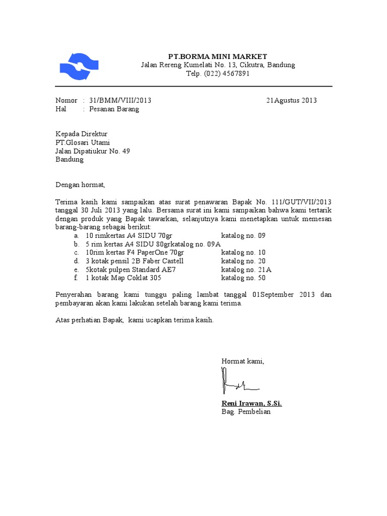 Surat pesanan barang merupakan salah satu surat niaga, karena merupakan surat yang dipakai dalam proses jual beli (perniagaan). Namun apabila anda mendapatkan surat penawaran dari suatu perusahaan, dan tertarik maka bisa mengirimkan surat pemesanan barang seperti contoh berikut ini. Nah contoh surat pesanan barang diatas merupakan salah satu contoh kasus dari perusahaan badrul mozila yang contoh surat pesanan barang sesuai dengan penawaran katalog. Untuk bisa berkembang dan maju dengan surat pesanan akan anda dapatkan sebagai balasan atau feedback positif dari surat penawaran. Contoh surat pesanan barang yang benar badrul mozila.