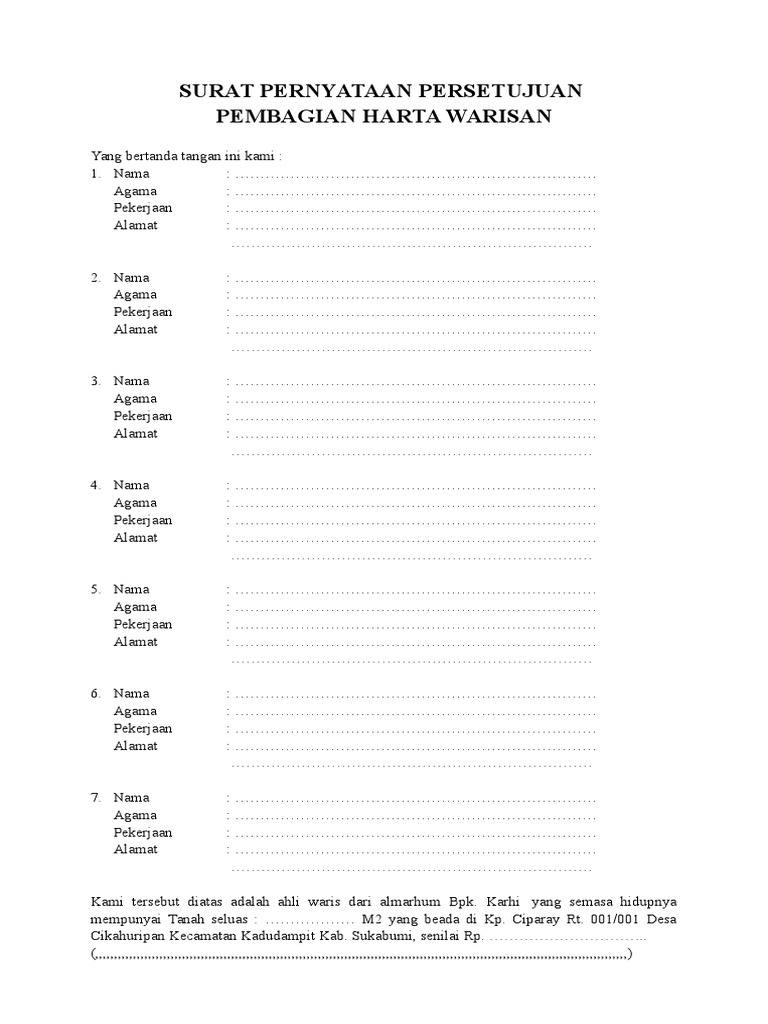 Pembagian harta warisan yang bertanda tangan ini kami : Contoh surat kuasa penjualan tanah warisan terbaru format. Contoh surat persetujuan ahli waris jual beli tanah surat box. Contoh surat pernyataan ahli waris tunggal; Contoh surat persetujuan ahli waris menjual tanah have an image associated with the other.contoh surat persetujuan ahli waris menjual tanah in addition, it will include a picture of a kind that may be seen in the gallery of contoh surat persetujuan ahli waris menjual tanah. Pada hari ini, senin 12 januari 2019, kami para ahli waris dari bapak warsito, telah sepakat untuk mewakafkan warisan yang ditinggalkan almarhum berupa tanah beserta dengan surat kepemilikanya untuk kepentingan pembangunan. Kami yang bertandatangan di bawah ini, menyatakan dengan sesungguhnya adalah ahli waris dari (nama pewaris). Komonitas mancing mania bungo menggelar acara bagi takjil dan buka puasa bersama; Contoh surat keterangan ahli waris. Contoh surat jual beli tanah warisan. 15 contoh surat keterangan ahli waris yang resmi dan sah. Contoh surat ahli waris dari kecamatan Namun untuk sekarang ini surat cenderung berkembang untuk alat andminitratif pelengkap sebuah dokumen dan biasanya bersift resmi.